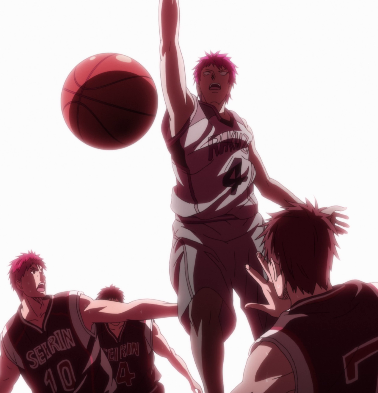 Avec la domination apparente d'Akashi, Rakuzan débute le 4e quart-temps avec une avance de 14 points. Lorsque Kimura tente de faire écran sur Akashi, ce dernier l'évite facilement, après l'avoir vu venir avec son large champ de vision. Midorima reçoit le ballon, mais ne peut pas se mettre en position de tir en raison de la défense d'Akashi. Lorsque Midorima se met en position de triple menace et tente de feinter Akashi, cette manœuvre est cependant inefficace car ce dernier lui vole le ballon. Il est attendu par Miyaji et Kimura à qui il ordonne de s’écarter. Ses adversaires lui rétorquent de ne pas aussi arrogant et d’arrêter d’espérer qu’ils s’écartent. Akashi se met alors à dribbler rapidement effectuant plusieurs crossovers et faisant s’effondrer les deux défenseurs suite à un Ankle Break. Il s’apprête à tirer mais Ōtsubo saute, ce qui force Akashi à effectuer une passe en opposition avec son coude vers Nebuya qui marque le panier.